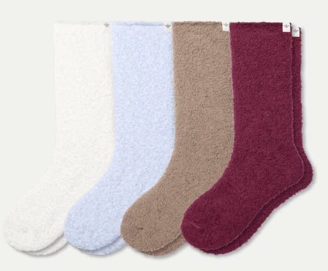 (Bombas Fuzzy Socks, Ugg Leda Cozy Socks - also available with sparkles, Le Bon Shoppe Cloud Socks, Hansel from Basel Cashmere Rib Crews)